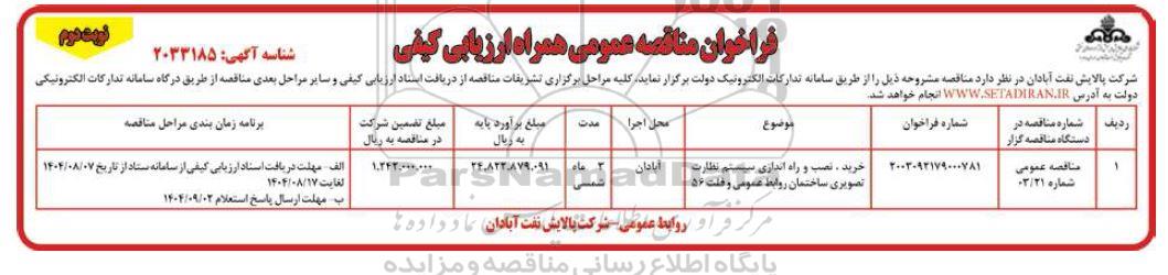 1 مناقصه عمومی دو مرحله ای شماره 03/21 2003092179000781 خرید، نصب و راه اندازی سیستم نظارت تصویری ساختمان روابط عمومی و فلت 56 آبادان 3 ماه شمسی 24.822.879.091 1.242.000.000 الف - مهلت دریافت اسناد ارزیابی کیفی از سامانه ستاد از تاریخ 1404.8.7 لغایت 1404.8.17