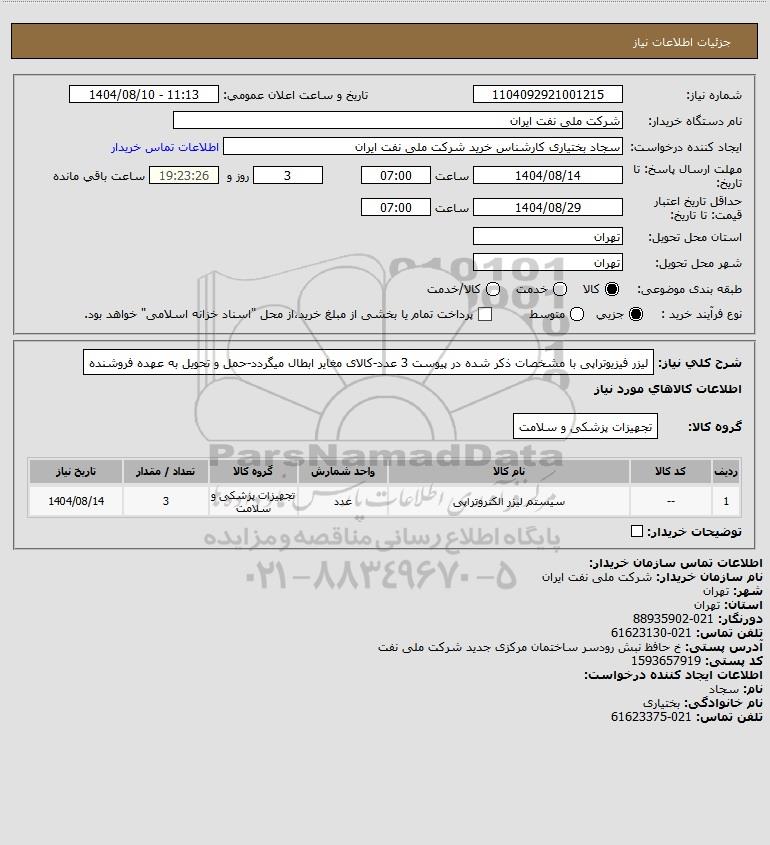 شرح کلی نیاز: لیزر فیزیوتراپی با مشخصات ذکر شده در پیوست 3 عدد-کالای مغایر ابطال میگردد-حمل و تحویل به عهده فروشنده