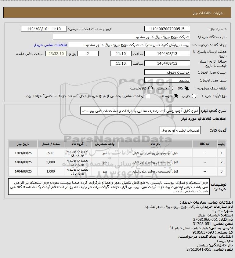 | 3 | -- | کابل آلومینیومی روکش پلی اتیلن | متر | تجهیزات تولید و توزیع برق | 1,000 | 1404/08/25 |