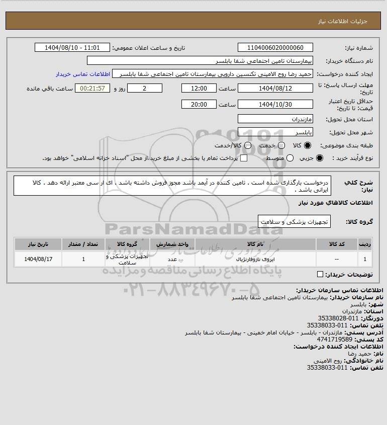 | 1 | -- | ایروی نازوفارنژیال | عدد | تجهیزات پزشکی و سلامت | 1 | 1404/08/17 |