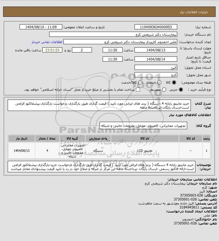 | 1 | -- | مانیتور LCD | دستگاه | تجهیزات مخابراتی، کامپیوتر، موبایل، ملزومات جانبی و شبکه | 4 | 1404/08/13 |