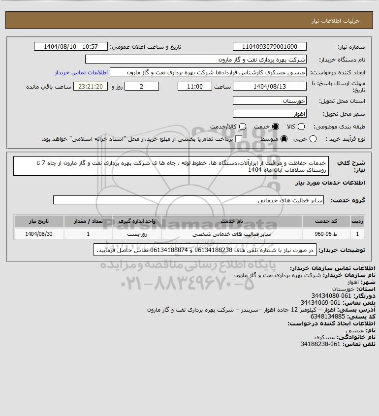 شرح کلی نیاز: خدمات حفاظت و مراقبت از ابزارآلات،دستگاه ها، خطوط لوله ، چاه ها ی شرکت بهره برداری نفت و گاز مارون از چاه 7 تا روستای سلامات آبان ماه 1404