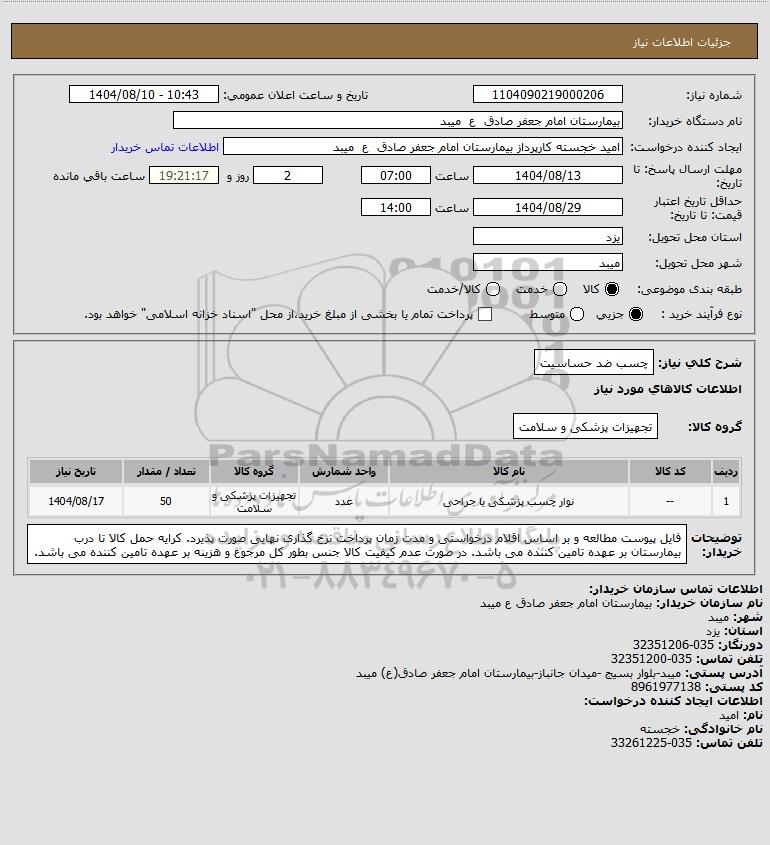 | 1 | -- | نوار چسب پزشکی یا جراحی | عدد | تجهیزات پزشکی و سلامت | 50 | 1404/08/17 |