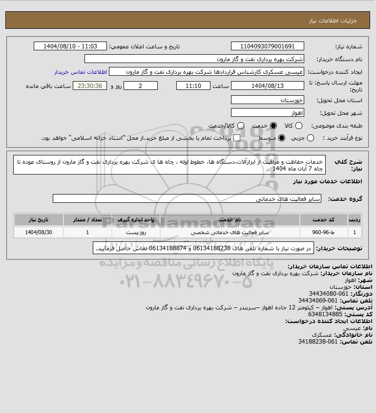 شرح کلی نیاز: خدمات حفاظت و مراقبت از ابزارآلات،دستگاه ها، خطوط لوله ، چاه ها ی شرکت بهره برداری نفت و گاز مارون از روستای عوده تا چاه 7 آبان ماه 1404