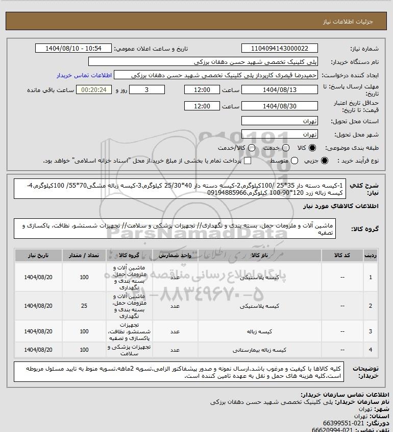 | 2 | -- | کیسه پلاستیکی | عدد | ماشین آلات و ملزومات حمل، بسته بندی و نگهداری | 25 | 1404/08/20 |