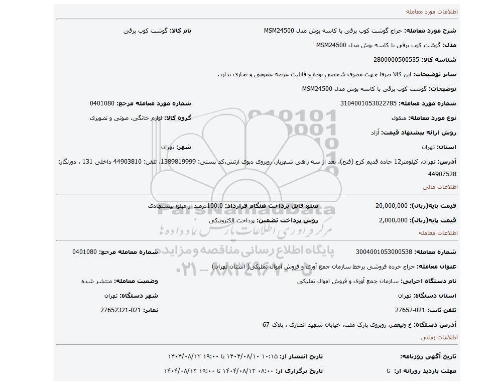| شماره مورد معامله: 3104001053022785 | شماره مورد معامله مرجع: 0401080 | |