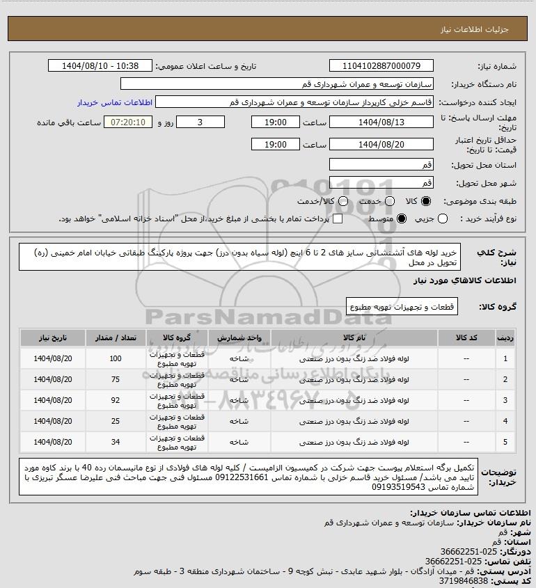 شرح کلی نیاز: خرید لوله های آتشنشانی سایز های 2 تا 6 اینچ (لوله سیاه بدون درز) جهت پروژه پارکینگ طبقاتی خیابان امام خمینی (ره) تحویل در محل