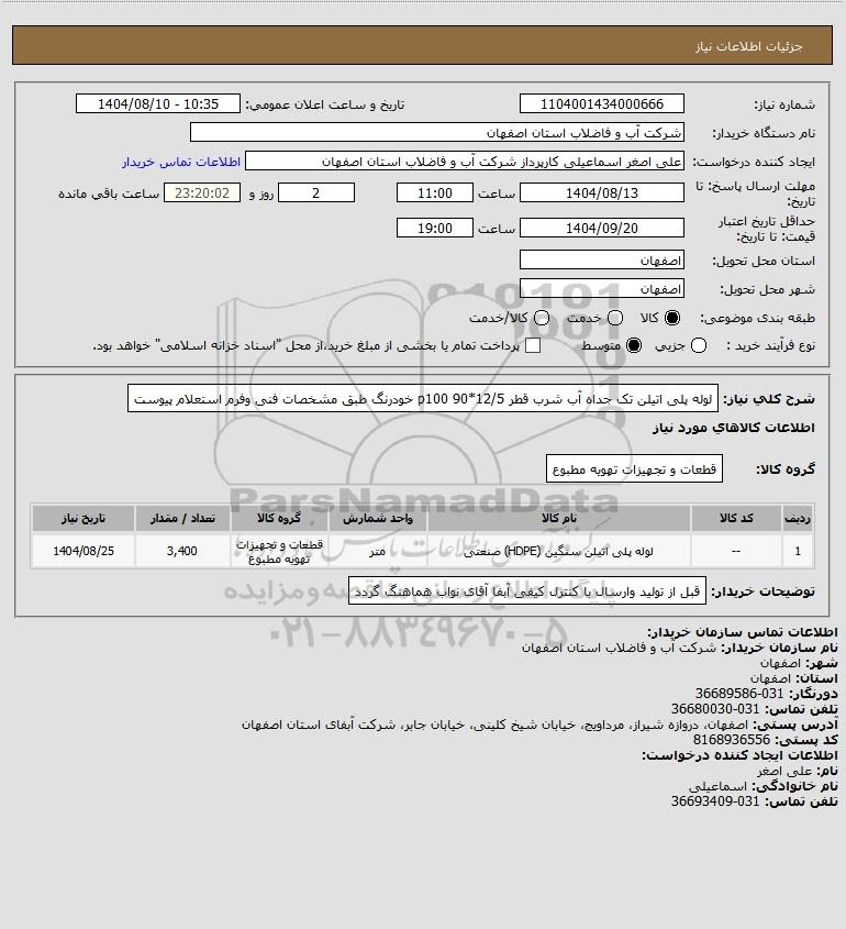 شرح کلی نیاز: لوله پلی اتیلن تک جداه آب شرب قطر 12/5*90 p100 خودرنگ طبق مشخصات فنی وفرم استعلام پیوست