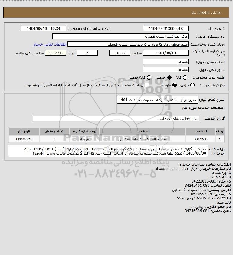 شرح کلی نیاز: سرویس ایاب ذهاب کارکنان معاونت بهداشت 1404