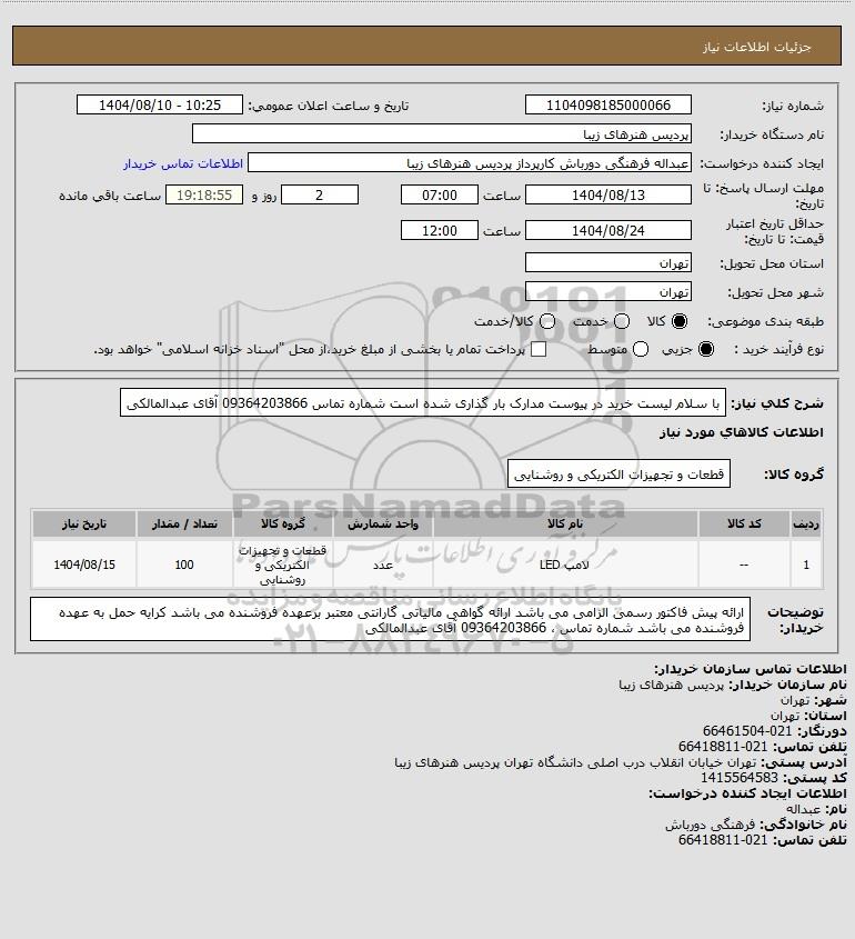 | 1 | -- | لامپ LED | عدد | قطعات و تجهیزات الکتریکی و روشنایی | 100 | 1404/08/15 |