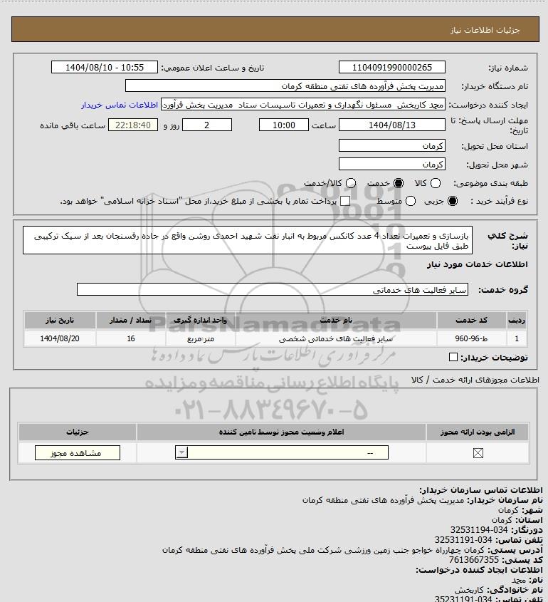 شرح کلی نیاز: بازسازی و تعمیرات تعداد 4 عدد کانکس مربوط به انبار نفت شهید احمدی روشن واقع در جاده رفسنجان بعد از سیک ترکیبی طبق فایل پیوست