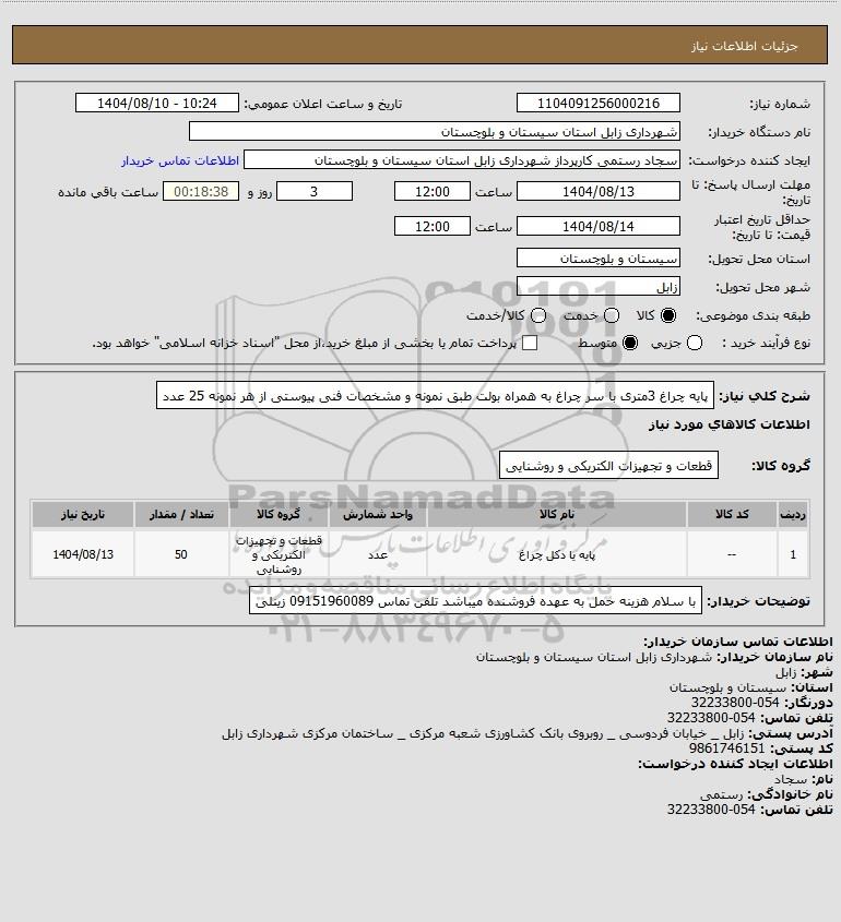 | 1 | -- | پایه یا دکل چراغ | عدد | قطعات و تجهیزات الکتریکی و روشنایی | 50 | 1404/08/13 |