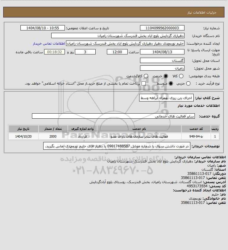 شرح کلی نیاز: اجرای بتن ریزی بهمراه آبراهه وسط