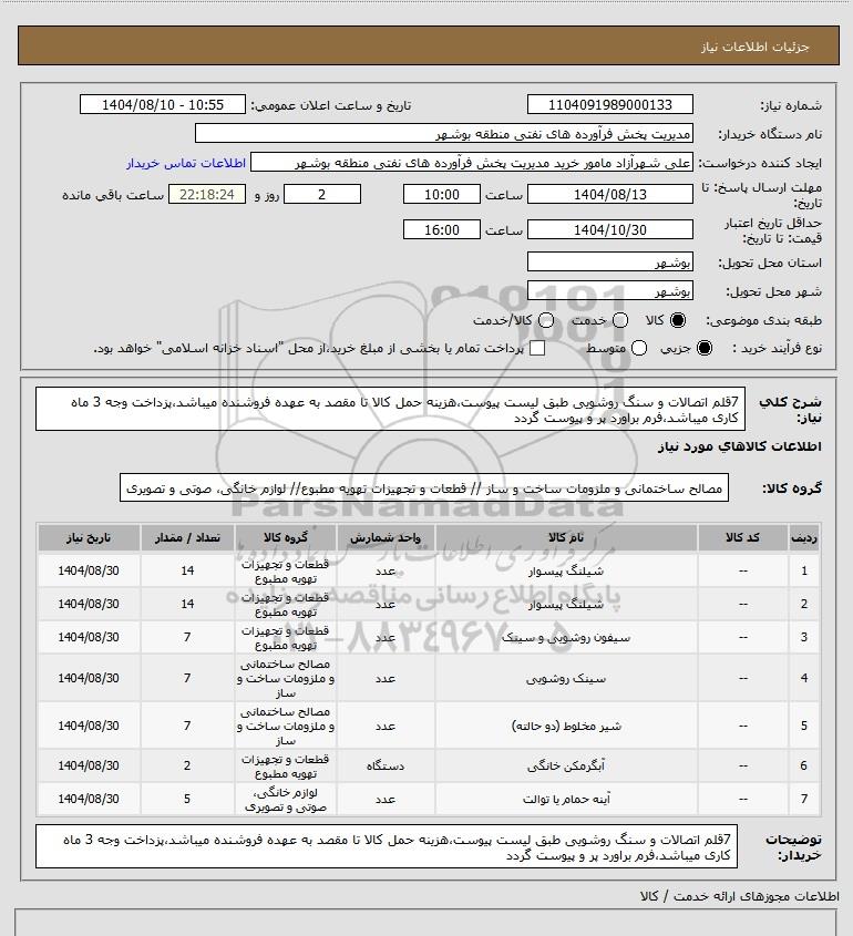 استعلام بها و موضوع استعلام استعلام 7قلم اتصالات و سنگ روشویی طبق لیست پیوست،هزینه حمل کالا تا مقصد به عهده فروشنده میباشد،پزداخت وجه 3 ماه کاری میباشد،فرم براورد پر و پیوست گردد به اطلاع کلیه شرکتها و افراد متخصص واجد شرایط میرساند، آگهی گذار در نظر دارد از طریق استعلام بها، نسبت به انتخاب و دریافت پیشنهادات اقدام نماید. این استعلام با کد آگهی ثبت شده در سامانه خبرگزاری پارس نماد : 9780485 منتشر شده است. مشخصات استعلام : تاریخ شروع استعلام: 1404/08/10 آخرین مهلت ارسال پیشنهاد قیمت : 1404/08/13 و محل اجرای پروژه : استان بوشهر میباشد. استعلام قیمت مورد درخواست : استعلام 7قلم اتصالات و سنگ روشویی طبق لیست پیوست،هزینه حمل کالا تا مقصد به عهده فروشنده میباشد،پزداخت وجه 3 ماه کاری میباشد،فرم براورد پر و پیوست گردد با دستهبندیهای تخصصی و گروه های مرتبط : انواع شیلنگ, تاسیسات ساختمانی, صنایع حرارتی و برودتی, صنایع شیشه, لوازم خانگی, لوله و اتصالات, سرویس های بهداشتی, سنگ, استعلام اطلاع رسانی میگردد.