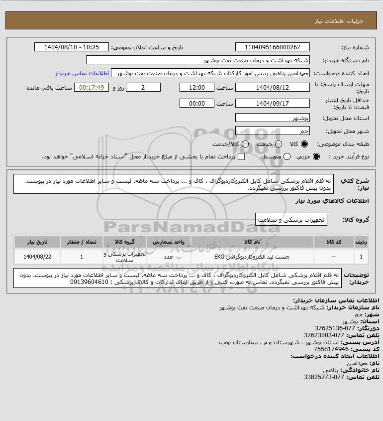 استعلام بها و موضوع استعلام استعلام نه قلم اقلام پزشکی شامل کابل الکتروکاردیوگراف ، کاف و ... پرداخت سه ماهه. لیست و سایر اطلاعات مورد نیاز در پیوست. بدون پیش فاکتور بررسی نمیگردد. به اطلاع کلیه شرکت‌ها و افراد متخصص واجد شرایط می‌رساند، آگهی گذار در نظر دارد از طریق استعلام بها، نسبت به انتخاب و دریافت پیشنهادات اقدام نماید. این استعلام با کد آگهی ثبت شده در سامانه خبرگزاری پارس نماد : 9780503 منتشر شده است. مشخصات استعلام : تاریخ شروع استعلام: 1404/08/10 آخرین مهلت ارسال پیشنهاد قیمت : 1404/08/12 و محل اجرای پروژه : استان بوشهر میباشد. استعلام قیمت مورد درخواست : استعلام نه قلم اقلام پزشکی شامل کابل الکتروکاردیوگراف ، کاف و ... پرداخت سه ماهه. لیست و سایر اطلاعات مورد نیاز در پیوست. بدون پیش فاکتور بررسی نمیگردد. با دسته‌بندی‌های تخصصی و گروه های مرتبط : خدمات و تجهیزات آزمایشگاهی و پزشکی, استعلام اطلاع رسانی میگردد.