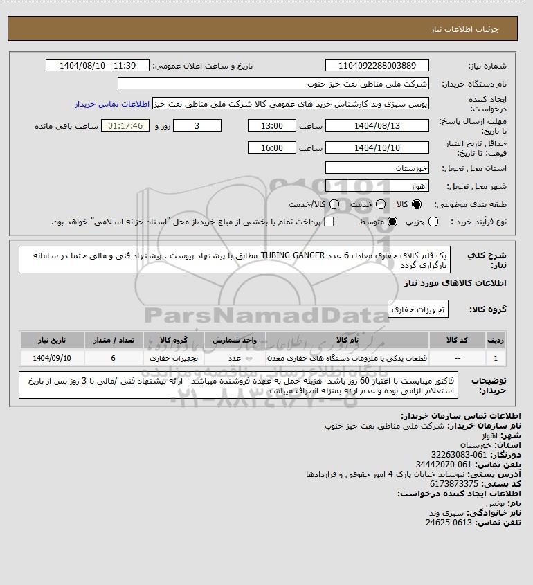 شرح کلی نیاز: یک قلم کالای حفاری معادل 6 عدد TUBING GANGER مطابق با پیشنهاد پیوست . پیشنهاد فنی و مالی حتما در سامانه بارگزاری گردد