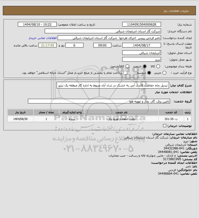 شرح کلی نیاز: تبدیل چاه حفاظت کاتدی آبی به خشک در شاد آباد مربوط به اداره گاز منطقه یک تبریز