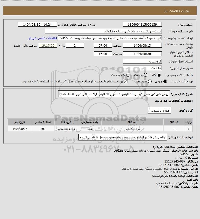 استعلام بها و موضوع استعلام استعلام روغن خوراکی سرخ کردنی 150لیترو پخت و پز 150لیتر دارای حداقل تاریخ انقضاء 6ماه به اطلاع کلیه شرکتها و افراد متخصص واجد شرایط میرساند، آگهی گذار در نظر دارد از طریق استعلام بها، نسبت به انتخاب و دریافت پیشنهادات اقدام نماید. این استعلام با کد آگهی ثبت شده در سامانه خبرگزاری پارس نماد : 9780520 منتشر شده است. مشخصات استعلام : تاریخ شروع استعلام: 1404/08/10 آخرین مهلت ارسال پیشنهاد قیمت : 1404/08/13 و محل اجرای پروژه : استان کردستان میباشد. استعلام قیمت مورد درخواست : استعلام روغن خوراکی سرخ کردنی 150لیترو پخت و پز 150لیتر دارای حداقل تاریخ انقضاء 6ماه با دستهبندیهای تخصصی و گروه های مرتبط : مواد غذایی, استعلام اطلاع رسانی میگردد.