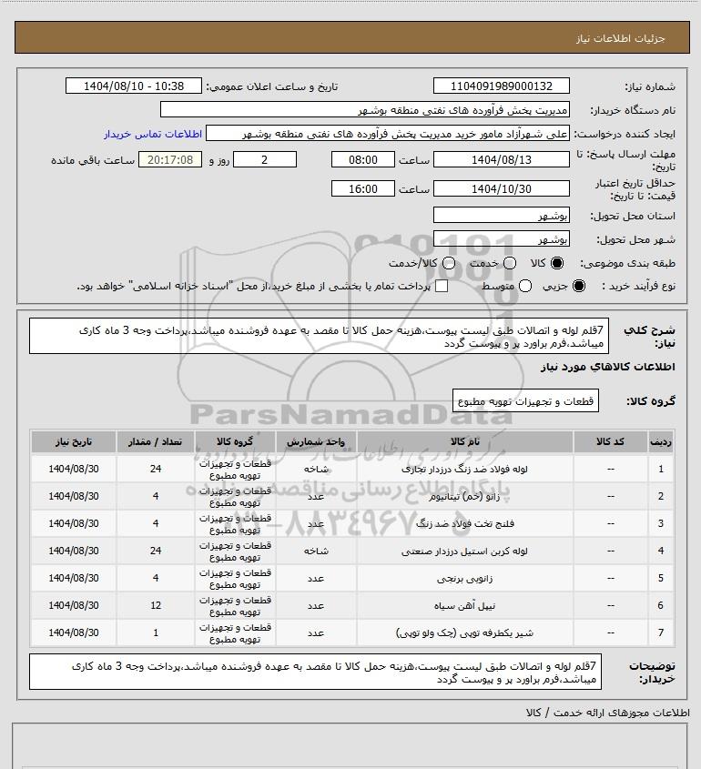 شرح کلی نیاز: 7قلم لوله و اتصالات طبق لیست پیوست،هزینه حمل کالا تا مقصد به عهده فروشنده میباشد،پرداخت وجه 3 ماه کاری میباشد،فرم براورد پر و پیوست گردد