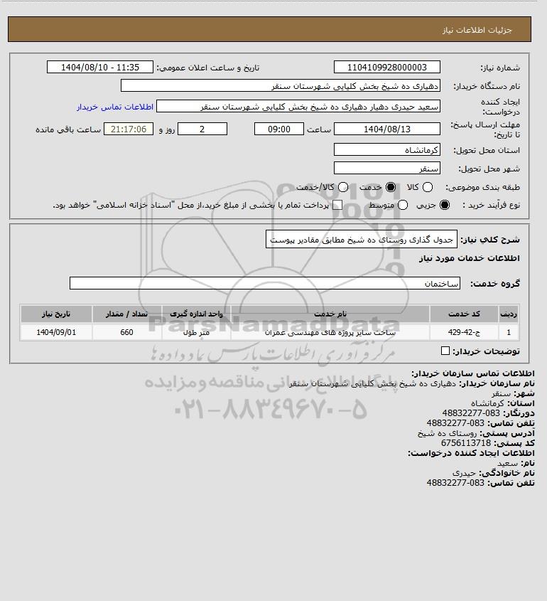 شرح کلی نیاز: جدول گذاری روستای ده شیخ مطابق مقادیر پیوست