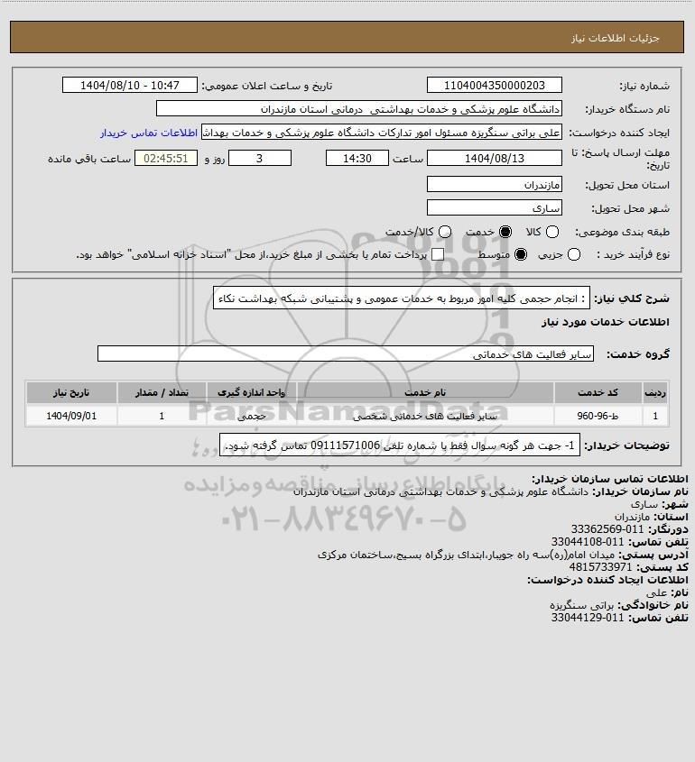 شرح کلی نیاز: : انجام حجمی کلیه امور مربوط به خدمات عمومی و پشتیبانی شبکه بهداشت نکاء