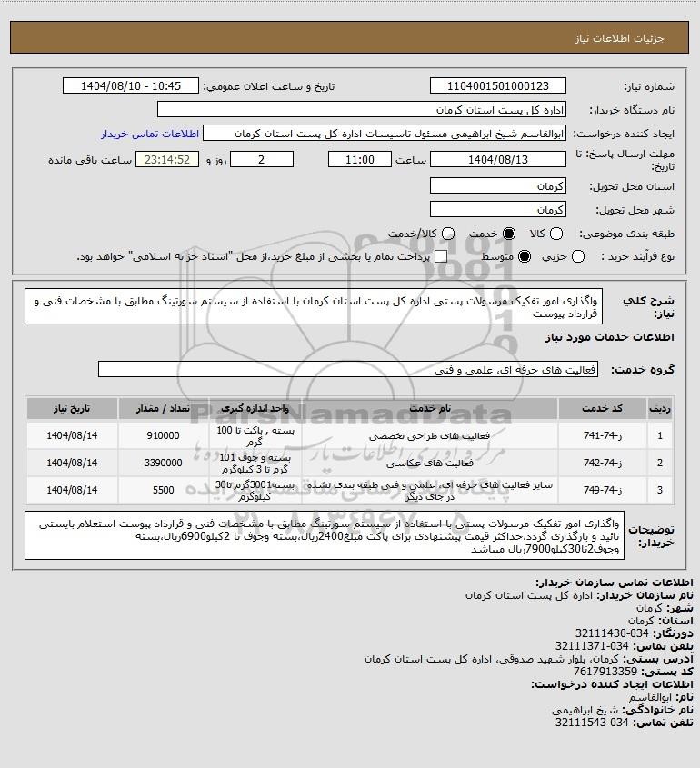 شرح کلی نیاز: واگذاری امور تفکیک مرسولات پستی اداره کل پست استان کرمان با استفاده از سیستم سورتینگ مطابق با مشخصات فنی و قرارداد پیوست