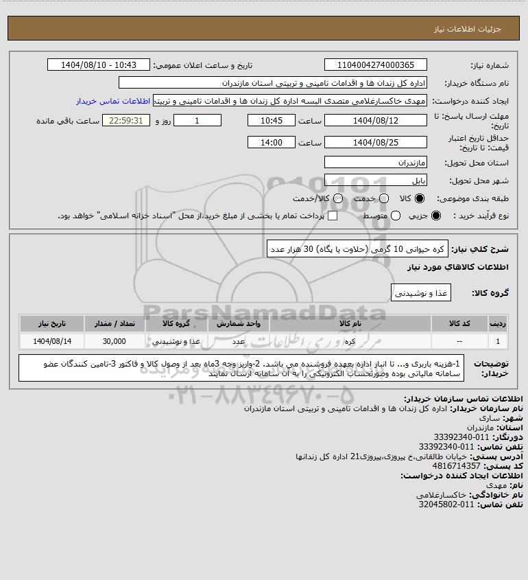 شرح کلی نیاز: کره حیوانی 10 گرمی (حلاوت یا پگاه) 30 هزار عدد