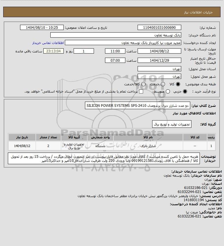 شرح کلی نیاز: دو عدد شارژر دیزل برندومدل 2410-SILICON POWER SYSTEMS SPS