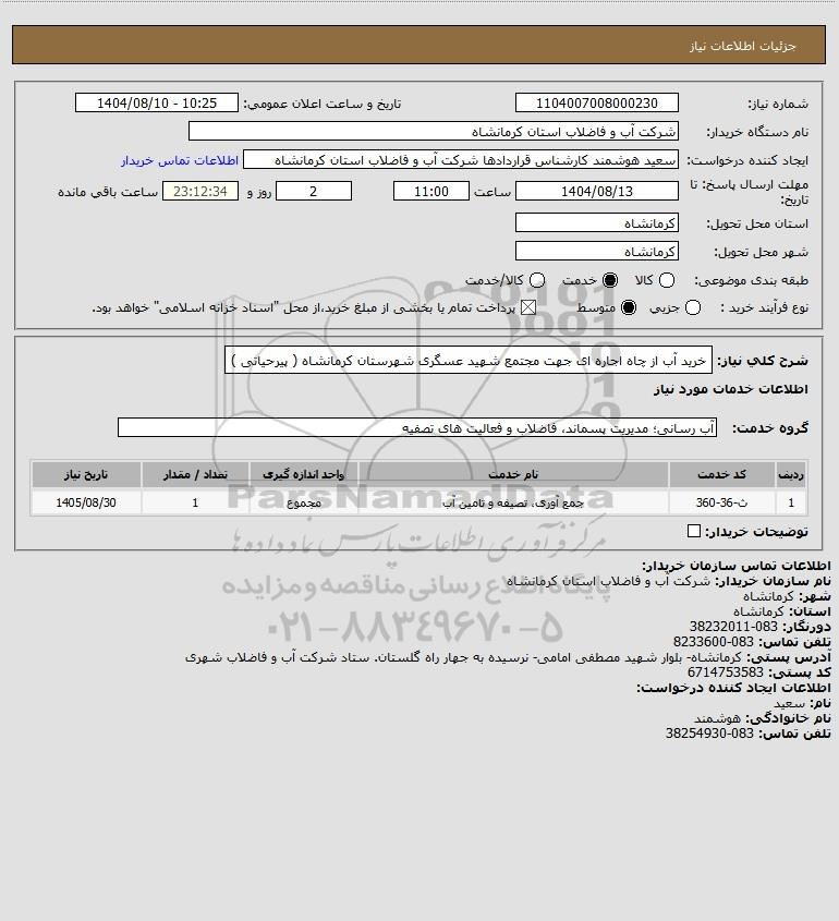 استعلام خرید آب از چاه اجاره ای جهت مجتمع شهید عسگری شهرستان کرمانشاه ( پیرحیاتی ), استعلام خرید آب از چاه اجاره ای جهت مجتمع شهید عسگری شهرستان کرمانشاه ( پیرحیاتی )