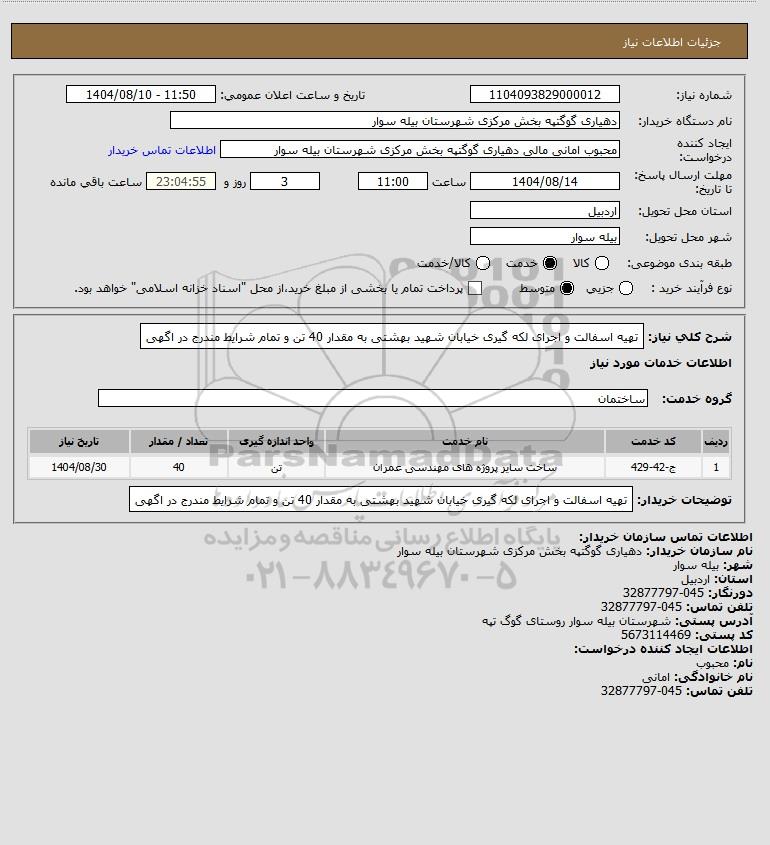 شرح کلی نیاز: تهیه اسفالت و اجرای لکه گیری خیابان شهید بهشتی به مقدار 40 تن و تمام شرایط مندرج در اگهی