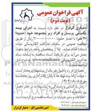 دهیاری کردزار در نظر دارد نسبت به اجرای بیمه تکمیلی پرسنل و افراد زیر مجموعه خود (حدودا 20 نفر) با اعتبار حدودا 3.000.000.000 ریال از طریق مناقصه عمومی در سامانه تدارکات الکترنیکی دولت ستاد اقدام نماید. لذا از متقاضیان واجد شرایط دعوت به عمل می آید برای دریافت اسناد مناقصه به سامانه ستاد ایران به شرح ذیل مراجعه نمایند
