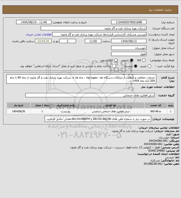 شرح کلی نیاز: خدمات حفاظت و مراقبت از ابزارآلات،دستگاه ها، خطوط لوله ، چاه ها ی شرکت بهره برداری نفت و گاز مارون از چاه 60 تا چاه 200 آبان ماه 1404