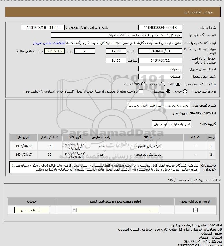 | 2 | -- | باتری نیکل کادمیوم | عدد | تجهیزات تولید و توزیع برق | 30 | 1404/08/17 |