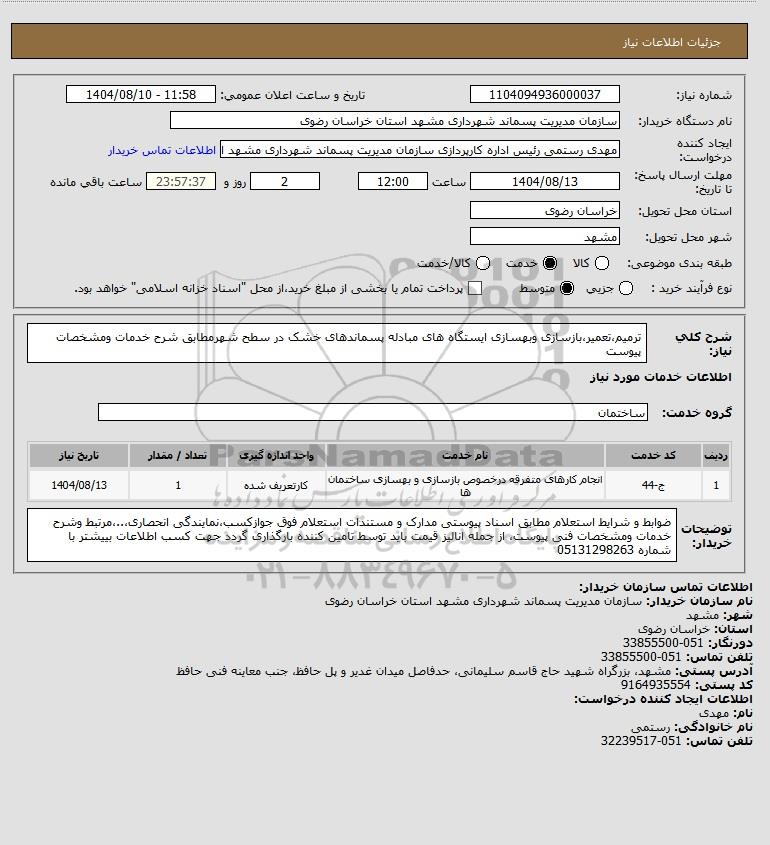 شرح کلی نیاز: ترمیم،تعمیر،بازسازی وبهسازی ایستگاه های مبادله پسماندهای خشک در سطح شهرمطابق شرح خدمات ومشخصات پیوست