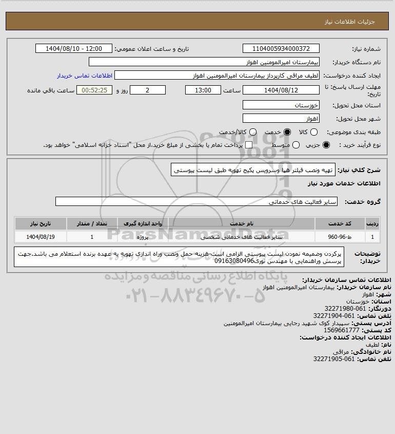 شرح کلی نیاز: تهیه ونصب فیلتر هپا وسرویس پکیج تهویه طبق لیست پیوستی