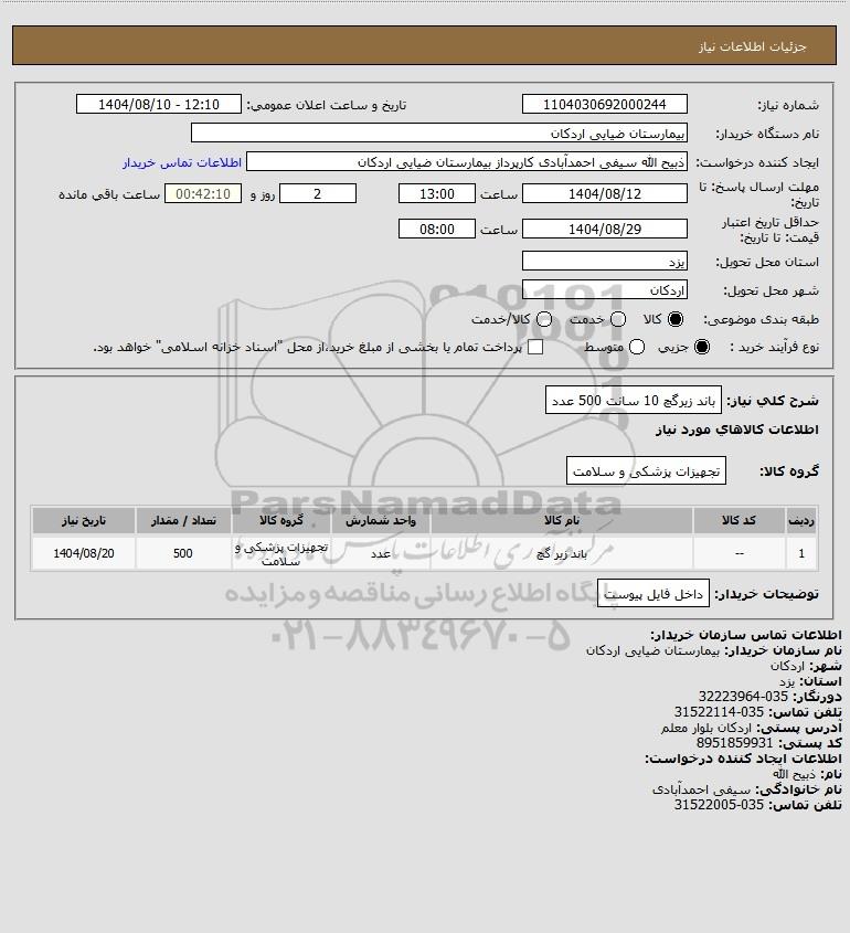 | 1 | -- | باند زیر گچ | عدد | تجهیزات پزشکی و سلامت | 500 | 1404/08/20 |
