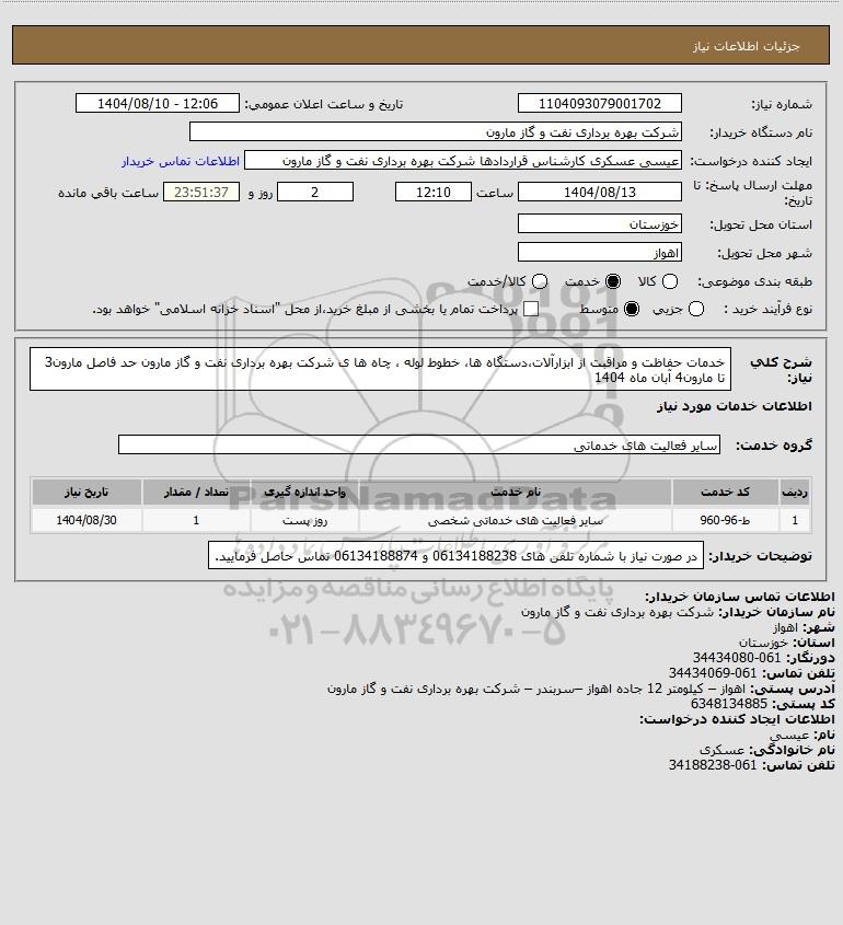 شرح کلی نیاز: خدمات حفاظت و مراقبت از ابزارآلات،دستگاه ها، خطوط لوله ، چاه ها ی شرکت بهره برداری نفت و گاز مارون حد فاصل مارون3 تا مارون4 آبان ماه 1404