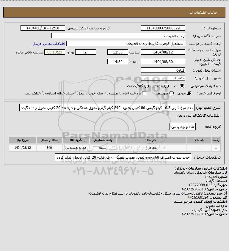 شرح کلی نیاز: تخم مرغ کارتن 10.5 کیلو گرمی 80 کارتن به وزن 840 کیلو گرم و تحویل هفتگی و هرهفته 20 کارتن تحویل زندان گردد