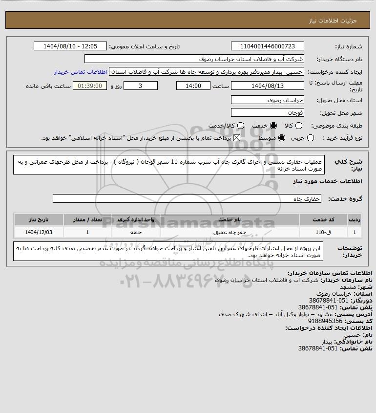 استعلام عملیات حفاری دستی و اجرای گالری چاه آب شرب شماره 11 شهر قوچان ( نیروگاه ) - پرداخت از محل طرحهای عمرانی و به صورت اسناد خزانه, استعلام عملیات حفاری دستی و اجرای گالری چاه آب شرب شماره 11 شهر قوچان ( نیروگاه ) - پرداخت از محل طرحهای عمرانی و به صورت اسناد خزانه