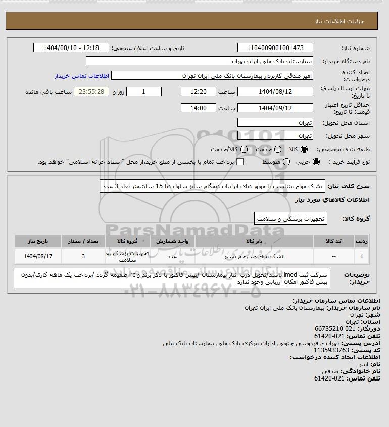 | 1 | -- | تشک مواج ضد زخم بستر | عدد | تجهیزات پزشکی و سلامت | 3 | 1404/08/17 |