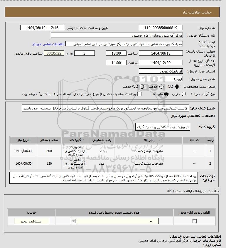 استعلام بها و موضوع استعلام استعلام کاست تشخیص سو مواد،باتوجه به توصیفی بودن درخواست، قیمت گذاری براساس شرح فایل پیوستی می باشد به اطلاع کلیه شرکت‌ها و افراد متخصص واجد شرایط می‌رساند، آگهی گذار در نظر دارد از طریق استعلام بها، نسبت به انتخاب و دریافت پیشنهادات اقدام نماید. این استعلام با کد آگهی ثبت شده در سامانه خبرگزاری پارس نماد : 9781029 منتشر شده است. مشخصات استعلام : تاریخ شروع استعلام: 1404/08/10 آخرین مهلت ارسال پیشنهاد قیمت : 1404/08/13 و محل اجرای پروژه : استان آذربایجان غربی میباشد. استعلام قیمت مورد درخواست : استعلام کاست تشخیص سو مواد،باتوجه به توصیفی بودن درخواست، قیمت گذاری براساس شرح فایل پیوستی می باشد با دسته‌بندی‌های تخصصی و گروه های مرتبط : خدمات و تجهیزات آزمایشگاهی و پزشکی, استعلام اطلاع رسانی میگردد.