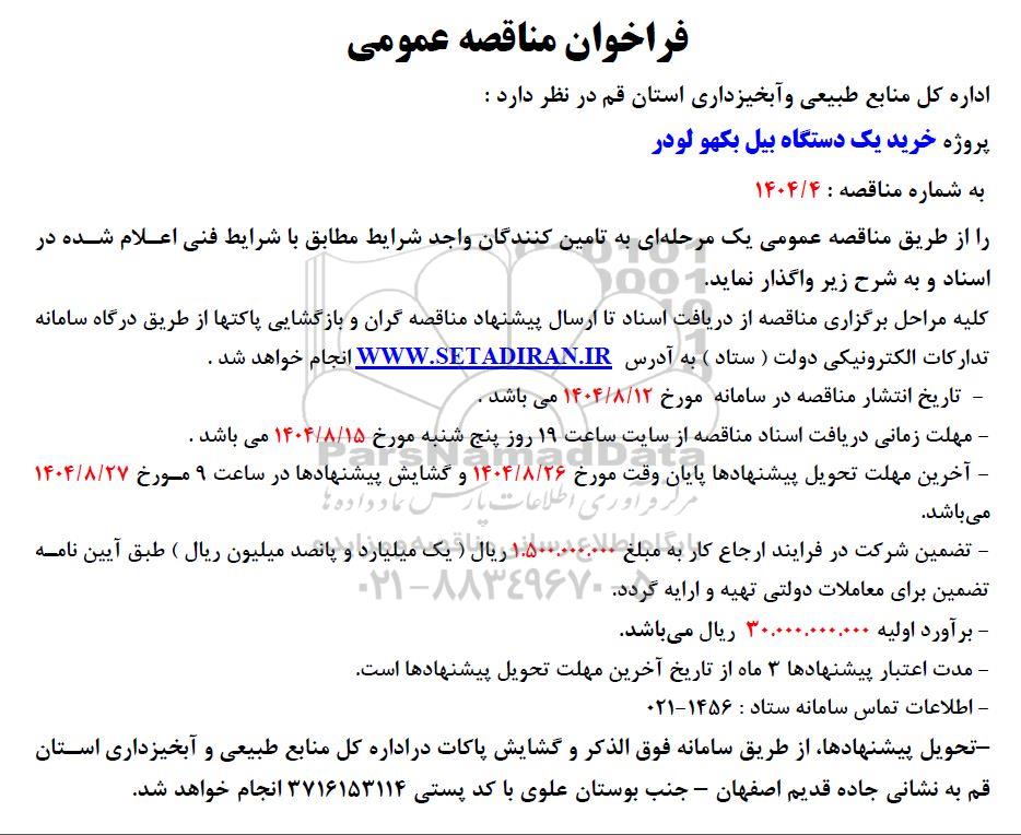 علاقهمندان میتوانند جهت دریافت اسناد و اطلاعات تکمیلی، فراخوان مناقصه عمومی خرید یک دستگاه بیل بکهو لودر با سامانه مناقصات و مزایدات ایران پارسنماد داده ها 88349670 تماس حاصل نمایند.