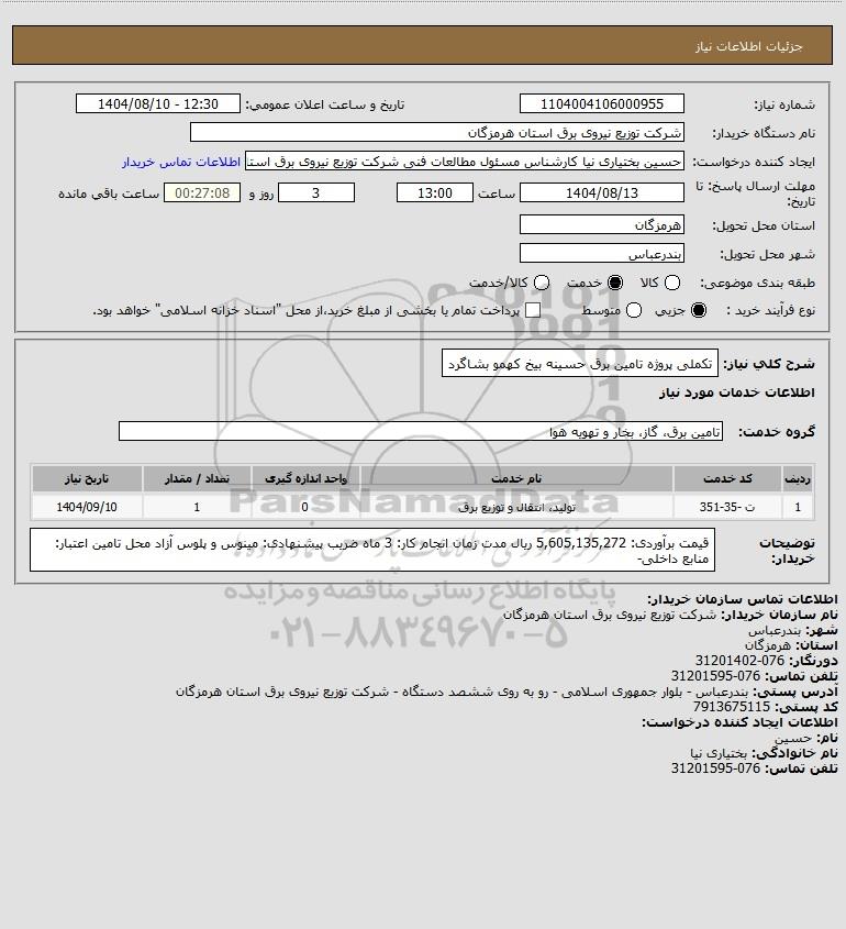 شرح کلی نیاز: تکملی پروژه تامین برق حسینه بیخ کهمو بشاگرد