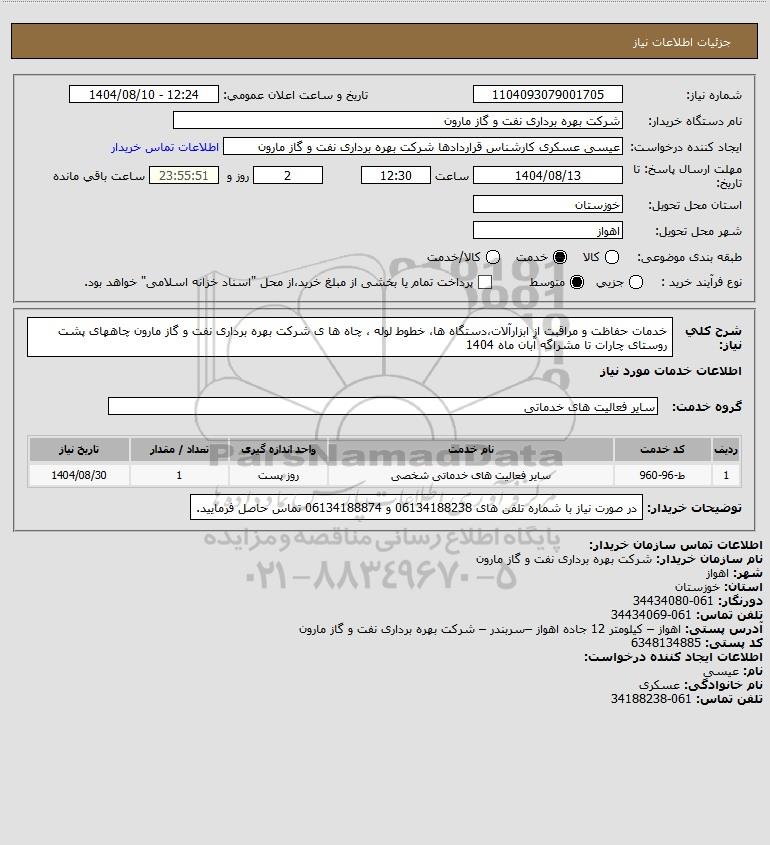 شرح کلی نیاز: خدمات حفاظت و مراقبت از ابزارآلات،دستگاه ها، خطوط لوله ، چاه ها ی شرکت بهره برداری نفت و گاز مارون چاههای پشت روستای چارات تا مشراگه آبان ماه 1404