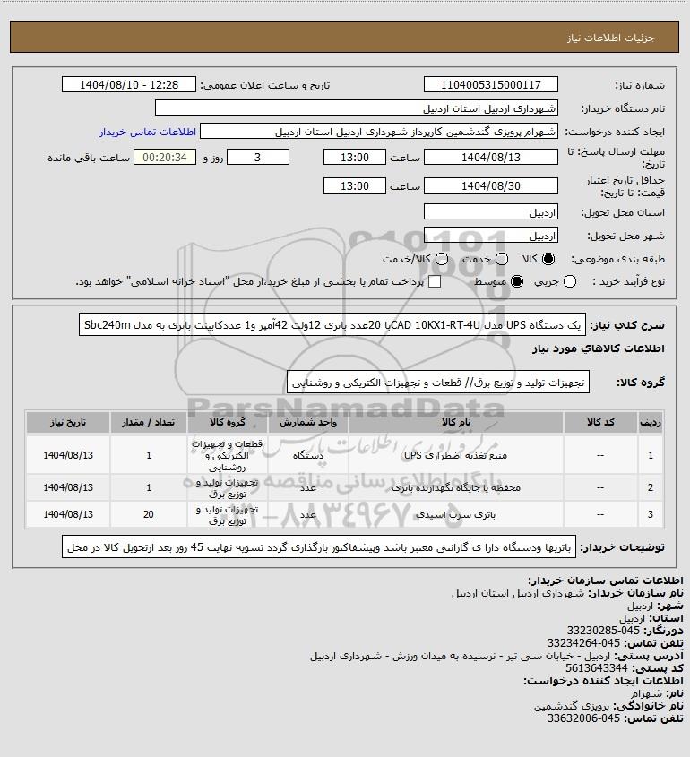 شرح کلی نیاز: یک دستگاه UPS مدل CAD 10KX1-RT-4Uبا 20عدد باتری 12ولت 42آمپر و1 عددکابینت باتری به مدل Sbc240m