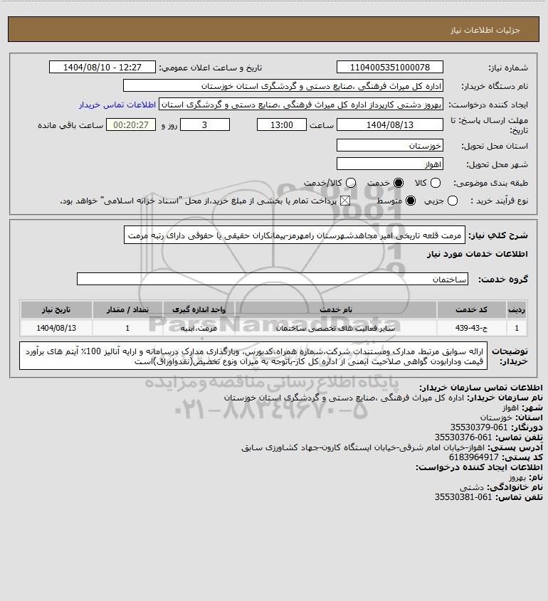 شرح کلی نیاز: مرمت قلعه تاریخی امیر مجاهدشهرستان رامهرمز-پیمانکاران حقیقی یا حقوقی دارای رتبه مرمت