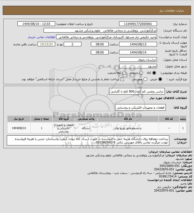شرح کلی نیاز: ترانس روغنی کم تلفات800 کاوا با گارانتی