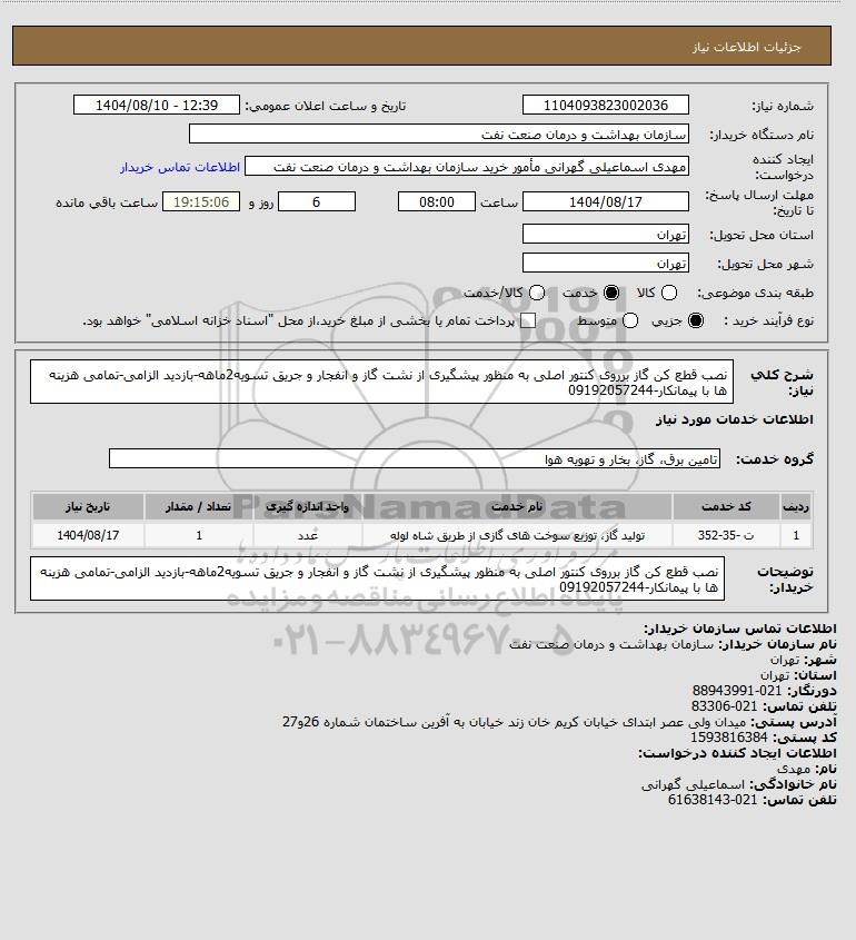 شرح کلی نیاز: نصب قطع کن گاز برروی کنتور اصلی به منظور پیشگیری از نشت گاز و انفجار و جریق تسویه2ماهه-بازدید الزامی-تمامی هزینه ها با پیمانکار-09192057244