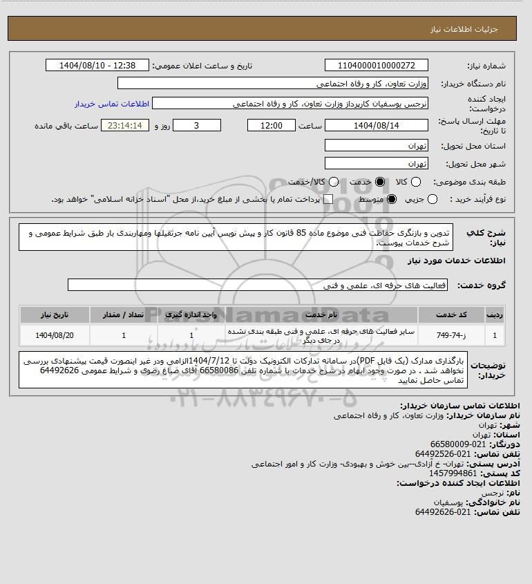 شرح کلی نیاز: تدوین و بازنگری حفاظت فنی موضوع ماده 85 قانون کار و پیش نویس آیین نامه جرثقیلها ومهاربندی بار طبق شرایط عمومی و شرح خدمات پیوست.