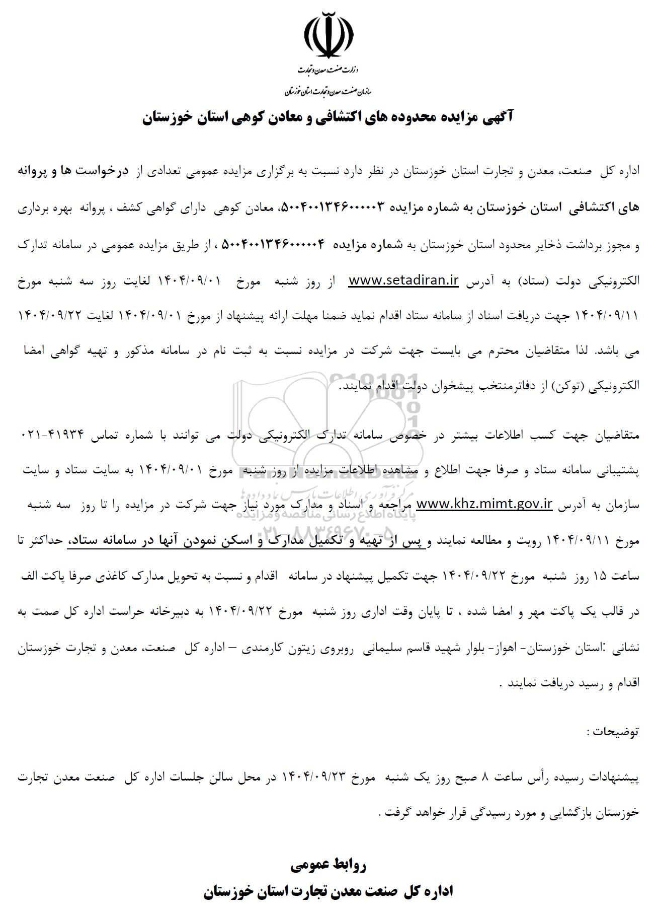 اداره کل صنعت، معدن و تجارت استان خوزستان در نظر دارد نسبت به برگزاری مزایده عمومی تعدادی از درخواست ها و پروانه های اکتشافی استان خوزستان به شماره مزایده 5004001346000003 معادن کوهی دارای گواهی کشف ، پروانه بهره برداری و مجوز برداشت ذخایر محدود استان خوزستان به شماره مزایده 5004001346000004 ، از طریق مزایده عمومی در سامانه تدارک الکترونیکی دولت (ستاد) به آدرس ستاد ایران از روز شنبه مورخ 1404.09.01 لغایت روز سه شنبه مورخ 1404.09.11 جهت دریافت اسناد از سامانه ستاد اقدام نماید ضمنا مهلت ارائه پیشنهاد از مورخ 1404.09.01 لغایت 1404.09.22 می باشد. لذا متقاضیان محترم می بایست جهت شرکت در مزایده نسبت به ثبت نام در سامانه مذکور و تهیه گواهی امضا الکترونیکی (توکن) از دفاتر منتخب پیشخوان دولت اقدام نمایند.